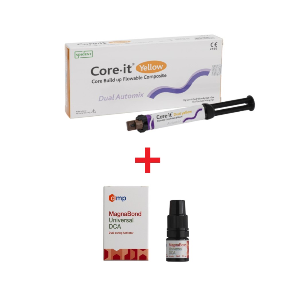 Core it Dual je dvostruko stvrdnjavajući kompozit i potreban je oprez kod izbora adheziva. Adhezive 6. i 7. generacije nije moguće upotrebljavati sa samo-stvrdnjavajućim (self-cure) dual kompozitnim materijalima zbog kiselosti adheziva, koja reagira sa alkalnom reakcijom katalizatora u dual kompozitnim materijalima, te ne dolazi do stvrdnjavanja. Preporuča se uporaba adheziva 8. generacije Magna Bond Universal pomiješanog s aktivatorom Magna Bond Universal DCA, koji imaju snagu vezivanja na dentin 27 MPa.